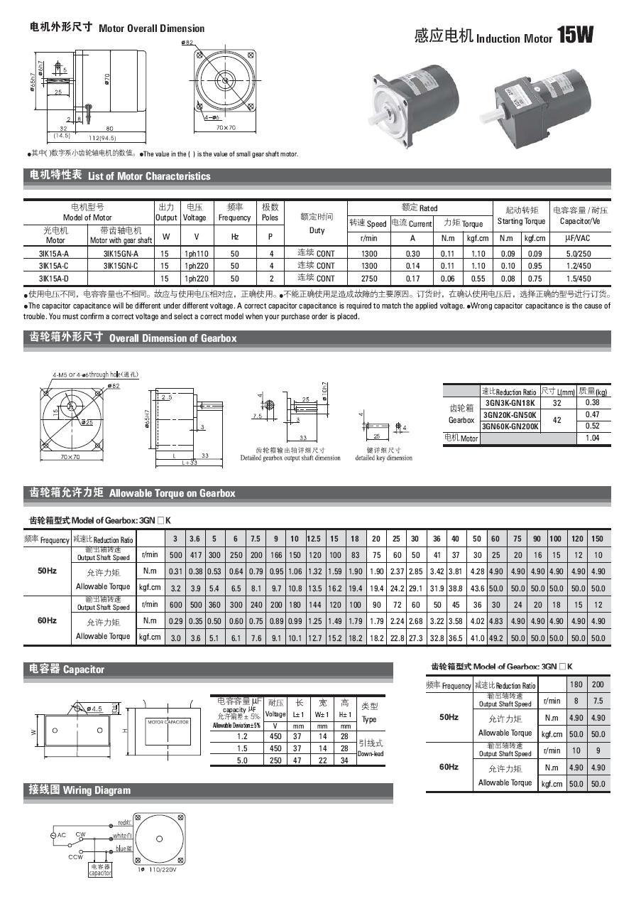 | 2.3IK15W电机特性和外形尺寸 | |