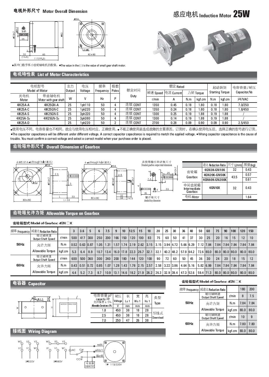 | 3.4IK25W电机特性与外形尺寸 | |