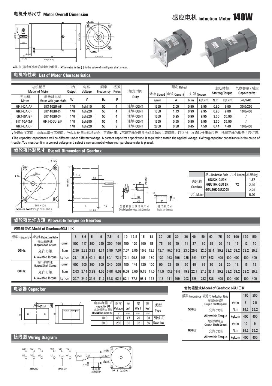 | 6.5IK140W电机特性与外形尺寸 |